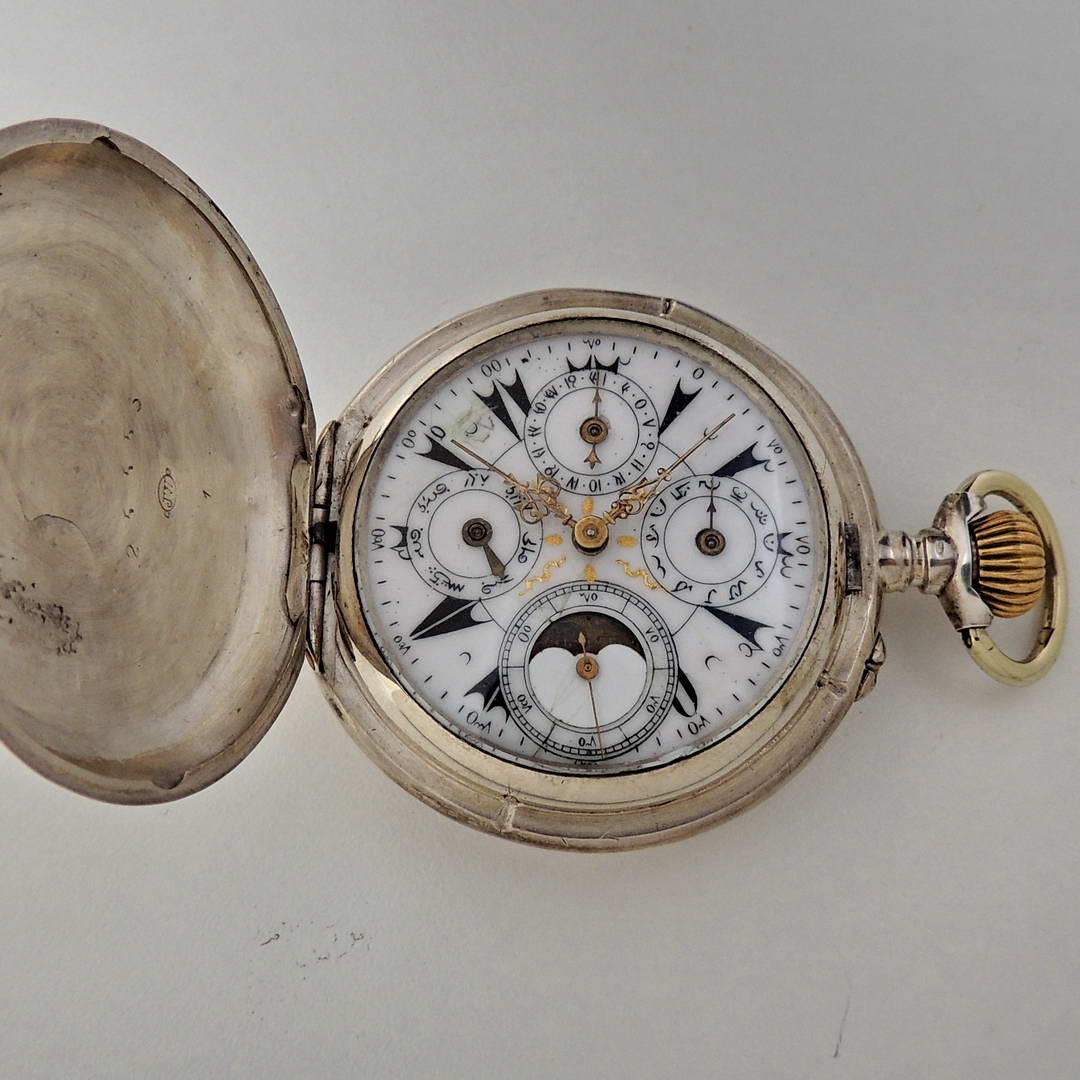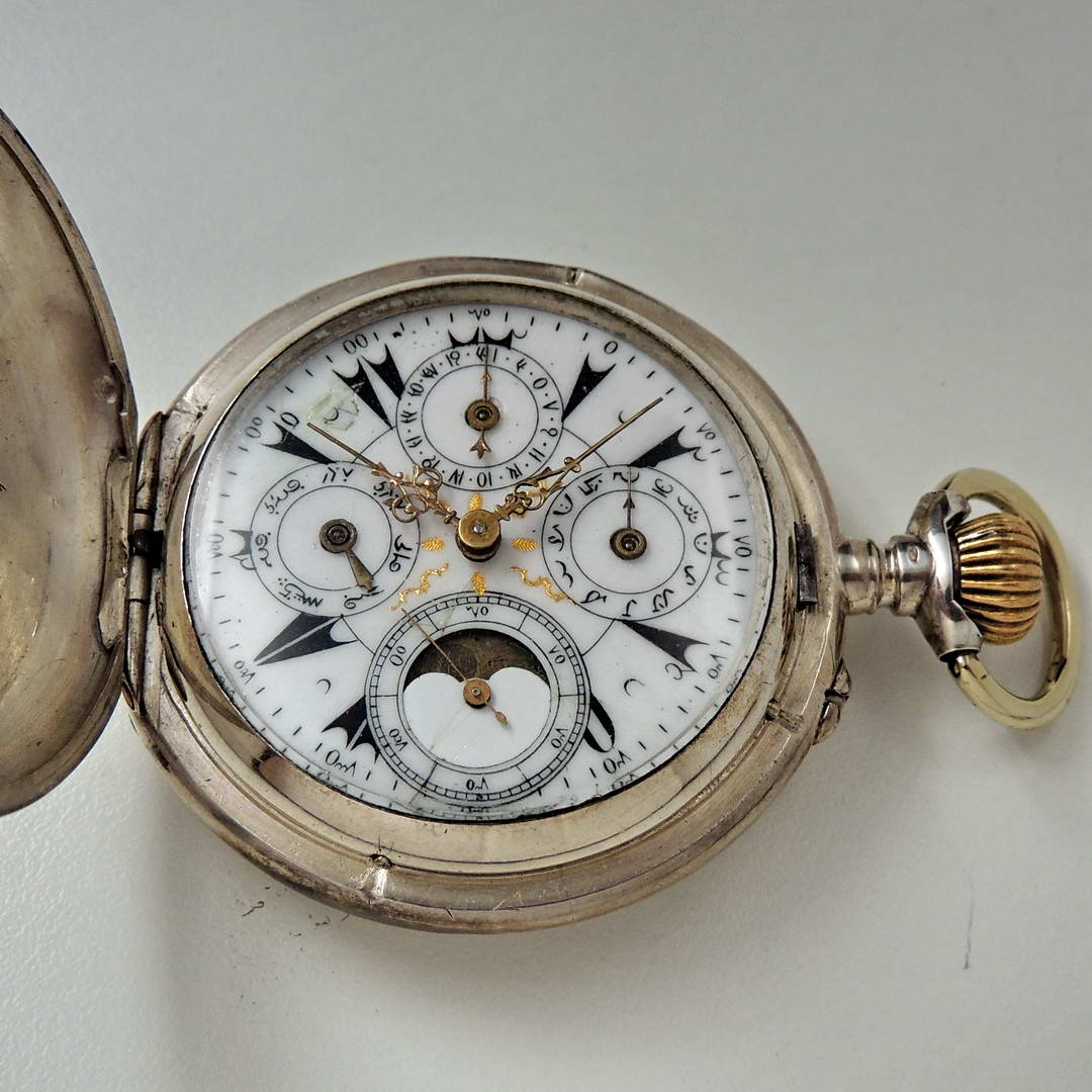 Эти редкие карманные часы с полным календарём выделяются оригинальным эмалевым циферблатом с османскими цифрами для дней и месяцев. Горячая эмаль со стекловидным глазурованным слоем придаёт циферблату глубокий, насыщенный вид.