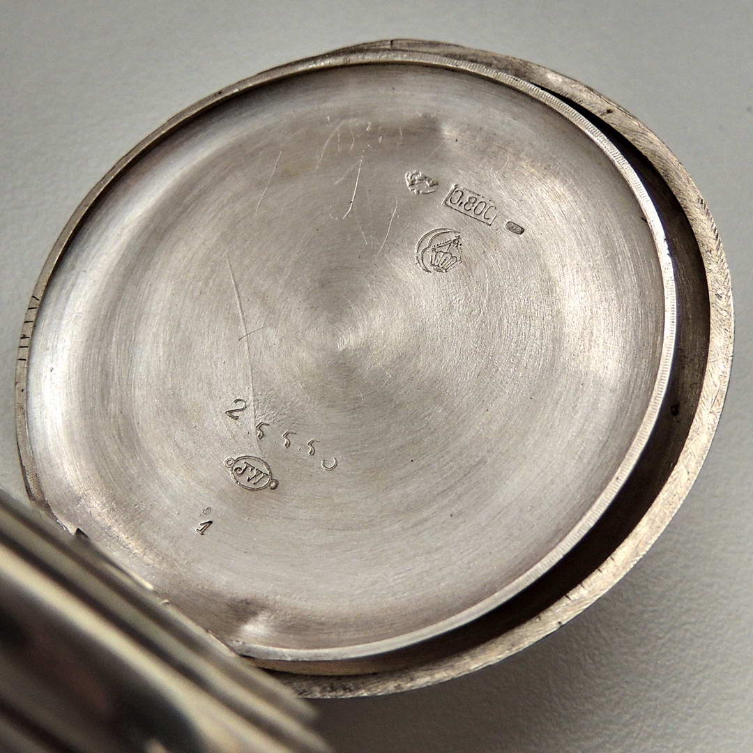 Корпус имеет пробу 0.800 (швейцарское серебро) и пробу «Germany silver», а также клеймо производителя корпуса «JW». На пылезащитной крышке выгравировано: «Ancre QUANTIEME Remontoir 15 Rubis».