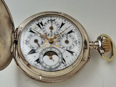 Редкие карманные часы с полным календарём: на оригинальном эмалевом циферблате использованы османские цифры для дней и месяцев. Горячая эмаль с стекловидной глазурью даёт глубокий, «стеклянный» эффект. Корпус пробирован под швейцарское серебро 0.800 и немецкое серебро, с клеймом мастера корпуса «JW». На пылезащитной крышке гравировка «Ancre QUANTIEME Remontoir 15 Rubis». Время переводится нажатием кнопки-поддавки на 4 часах (стрелки переводить только вперёд!). Корректоры даты, дня, месяца и фазы Луны - кнопочные, на боковых гранях безеля. Часы недавно обслужены и поставляются с гарантией 6 месяцев.