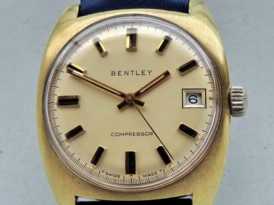 Почему бы не добавить в коллекцию этот стильный Bentley? Модель выполнена в знаменитом и коллекционном корпусе «Patent 313813 Compressor», впервые разработанном компанией EPSA (Ed. Piquerez SA) — патентованным производителем корпусов и заводных головок, создавшим также легендарные корпуса типа «super compressor». Дата производства выбита внутри задней крышки: 5‑70 (май 1970) — отличный пример дизайна винтажных часов 1970‑х. Есть удобная функция быстрой смены даты: дата переводится вперёд, если повернуть стрелки назад до «8», а затем снова вперёд до полуночи.