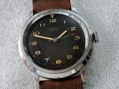 Харизматичные ранние пилотские LANCO 1940‑х с узнаваемым немецким авиаторским стилем: крупный корпус, чёрный тропический циферблат, люминесцентные арабские цифры и вращающаяся внутренняя шкала с светящейся стрелкой‑указателем для отсчёта интервалов. Это не навигационный хронометр B‑Uhr, а более практичные «флигеры» эпохи — всё равно по‑настоящему крупные для своего времени. Люм профессионально заменён на безопасный состав и искусственно состарен для сохранения винтажного облика. Часы укомплектованы ремешком ручной работы в милитари‑стиле и полностью обслужены.